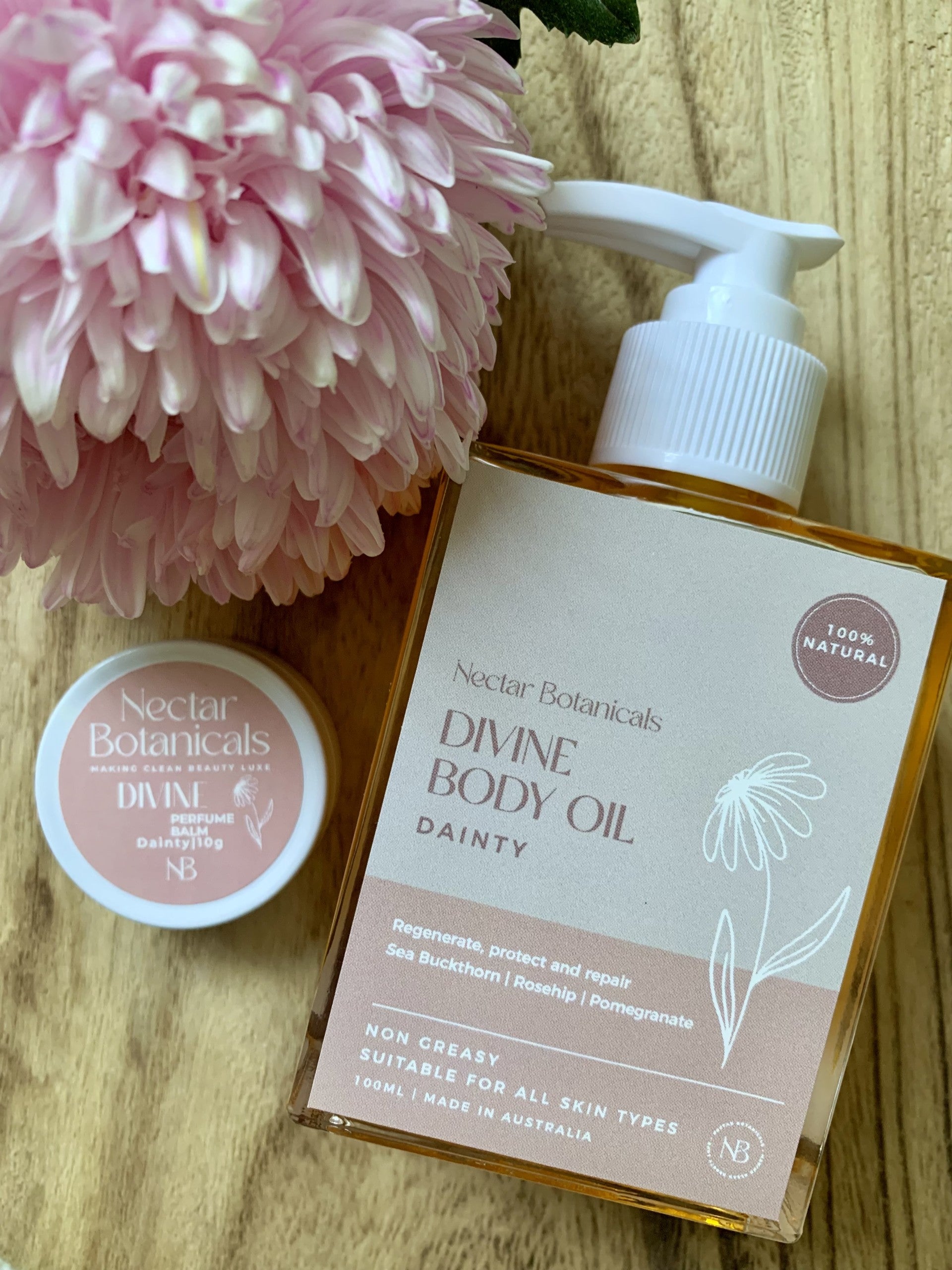 The Divine Body Bundle in our gorgeous Dainty fragrance gives your skin all it craves to smell delightful and feel silky, glowing, deeply moisturised, and pampered. This lovely set includes the Divine Perfume Balm and Divine Body Oil, both infused with our beloved Dainty blend of pure essential oils and absolutes.